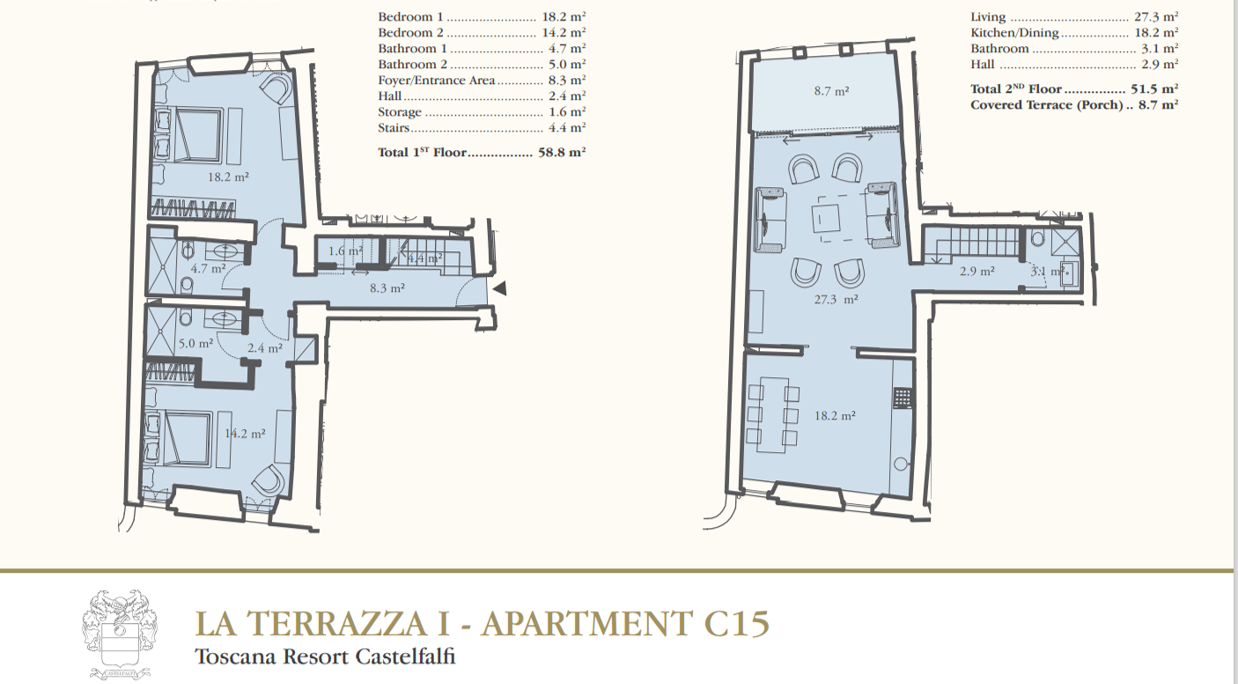 L’appartamento di circa 100 mq, posto all’interno di un antico palazzo completamente ristrutturato, è composto al piano primo da ingresso, due camere matrimoniali, due bagni dotati di doccia, lavandino, wc e bidet, oltre a due disimpegni e ripostiglio sottoscala con lavatrice. Dalla scala interna si accede al piano secondo dove si trova un terzo bagno, con doccia, wc e lavandino, e un’ampia zona giorno con cucina e living dalla quale, attraverso una vetrata, si accede a loggia coperta con vista sulle splendide colline toscane e sulla piscina.  L’appartamento è arredato con gusto moderno e con arredi di qualità. La casa è dotata di wi fi,  aria condizionata, riscaldamento, zanzariere, tv e cucina attrezzata con forno (con funzione anche di microonde), frigorifero e lavastoviglie.